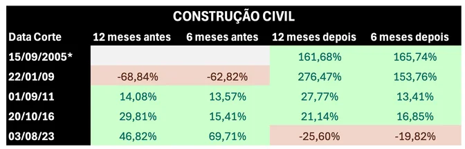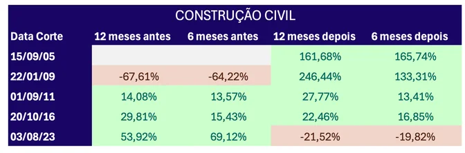 No setor de construção civil, o histórico mostra que essa lógica também se confirmou. Um estudo feito por Bruna Sene, analista de renda variável da Rico, a pedido do InfoMoney, mostra que as ações do setor reagiram de forma positiva tanto antes quanto depois das quedas de juros, com destaque para os movimentos pós-corte.
