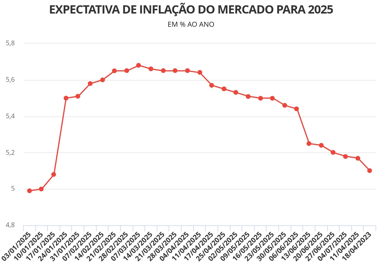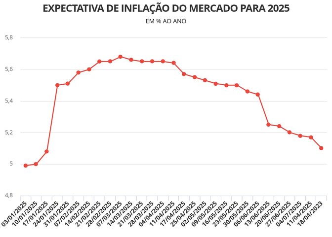 - Para a inflação de 2025, a estimativa do mercado recuou de 5,17% para 5,10%. Mesmo assim, continua bem acima do teto da meta, que é de 4,5%.