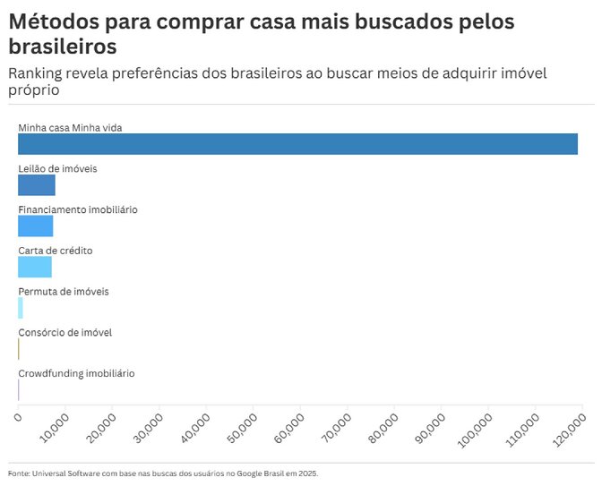 No ranking, o programa para conquista da casa própria do Governo Federal “Minha Casa, Minha Vida” (MCMV) apareceu no topo da lista, com 119 mil buscas. Na sequência, vêm “leilão de imóveis” (7.900), financiamento imobiliário (7.400) e carta de crédito (7.100).