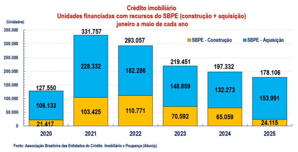 Um dos pontos mais críticos do período foi a forte retração no crédito voltado à produção no setor. Nos primeiros cinco meses de 2025, foram financiadas apenas 24.115 unidades com recursos do Sistema Brasileiro de Poupança e Empréstimo (SBPE), uma redução de 62,9% em relação ao mesmo período de 2024. Em valores, a queda chegou a 54,1%, passando de R$ 15,5 bilhões para R$ 7,1 bilhões.