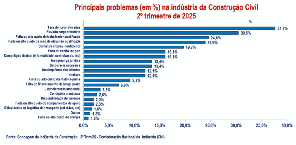 No entanto, o Índice de Confiança do Empresário da Construção (que integra a Sondagem) recuou para 47,1 pontos em julho, menor valor do ano. A percepção negativa está relacionada à alta dos juros, à Inflação acumulada em 12 meses (5,35%) e às incertezas macroeconômicas, como a política fiscal e a nova tarifação de produtos brasileiros nos Estados Unidos. O Índice mede o grau de otimismo ou pessimismo dos empresários do setor da construção civil em relação ao ambiente atual e às perspectivas para os próximos meses.