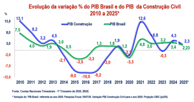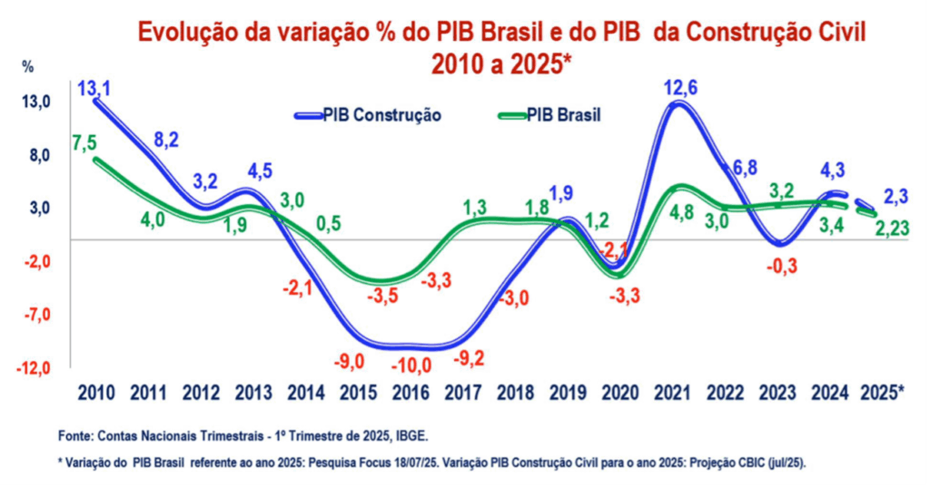 A CBIC manteve sua projeção de crescimento para 2025 em 2,3%, pela segunda vez consecutiva. Segundo Ieda, a estimativa carrega “um leve otimismo”, sustentado pela inércia de lançamentos anteriores, que ainda geram atividade e emprego no presente.