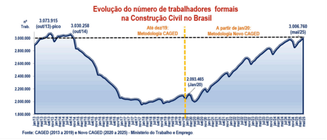 A Câmara Brasileira da Indústria da Construção (CBIC) apresentou nesta segunda-feira (25) um raio-x sobre o desempenho da construção civil no 2º trimestre de 2025. A análise, conduzida pela economista-chefe da entidade, Ieda Vasconcelos, revelou um paradoxo no setor: enquanto o número de empregos formais ultrapassou a marca histórica de 3 milhões pela primeira vez desde 2014, o crédito à produção sofreu uma retração expressiva, acendendo o alerta para o médio prazo.