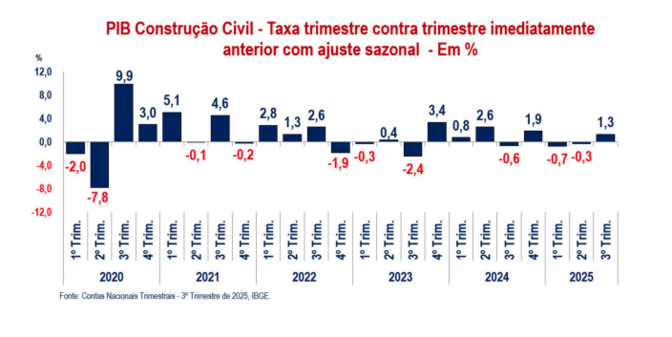 Depois de duas quedas consecutivas, o setor da construção voltou a crescer e registrou alta de 1,3% no 3º trimestre de 2025, na comparação com o trimestre anterior, na série com ajuste sazonal. O resultado superou o desempenho da economia brasileira, que ficou praticamente estável no período, com alta de 0,1%, segundo dados do Produto Interno Bruto (PIB), divulgados pelo Instituto Brasileiro de Geografia e Estatística (IBGE). A Indústria cresceu 0,8%, a Agropecuária 0,4% e os Serviços 0,1%.