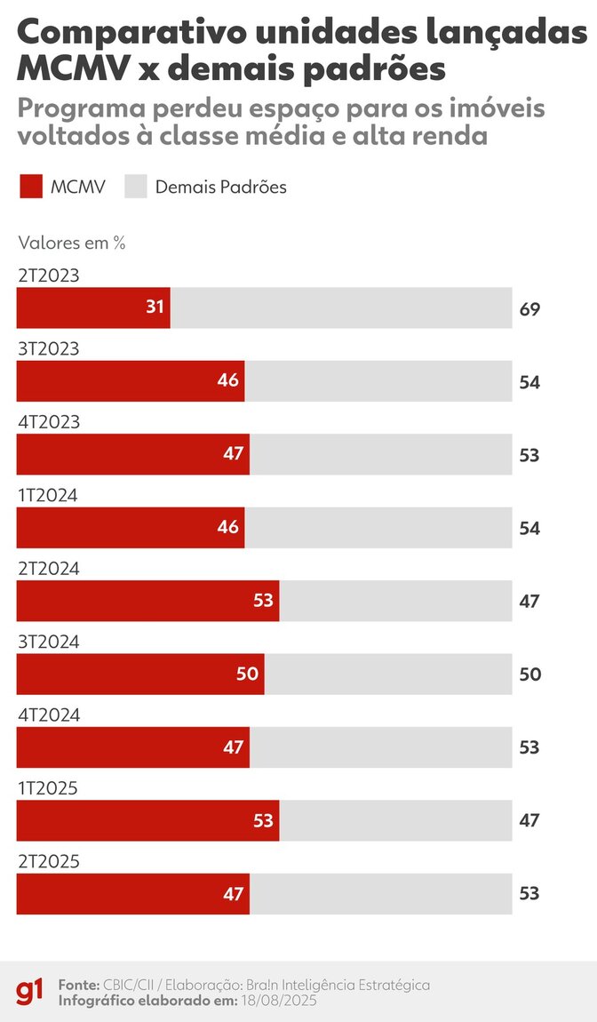 - A fatia do MCMV caiu de 53% para 47% do total entre o primeiro e o segundo trimestre de 2025.