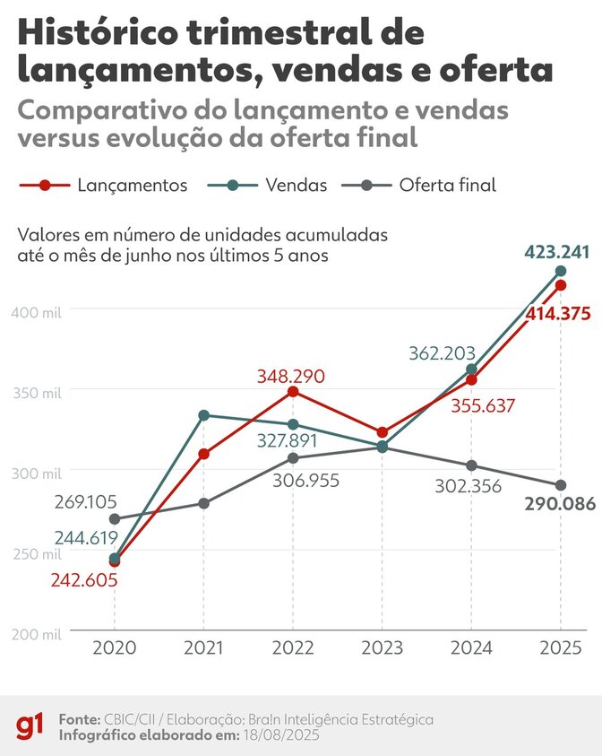 Segundo a pesquisa Indicadores Imobiliários Nacionais, da Câmara Brasileira da Indústria da Construção (CBIC), houve um aumento de 6,8% em relação ao mesmo período de 2024, alcançando 186,5 mil unidades — o melhor resultado desde o início da série em 2006.