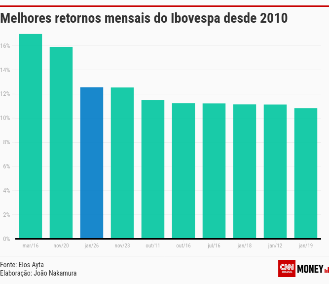 O principal índice da bolsa de valores brasileira registrou alta acumulada de 12,56% em janeiro, o terceiro melhor resultado em 16 anos, segundo levantamento da Elos Ayta.