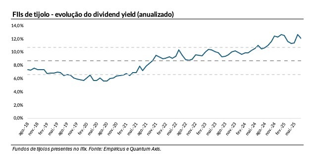 Assim como os fundos de tijolo, os fundos de crédito imobiliário também podem capturar ganhos com o fechamento da curva de juros. Hoje, esses veículos são negociados a taxas implícitas elevadas — entre IPCA + 9% e IPCA + 11% ao ano — e, por isso, oferecem uma combinação atrativa de carrego e potencial de ganho de capital.