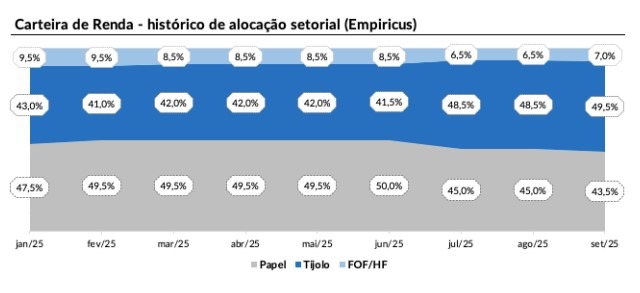 Antecipando este cenário, realizamos a primeira migração entre setores no mês de julho nas assinaturas de FIIs da Empiricus, com aumento da alocação em fundos de tijolo nas estratégias. Contudo, o ambiente geopolítico conturbado afetou a percepção de risco dos investidores desde então.