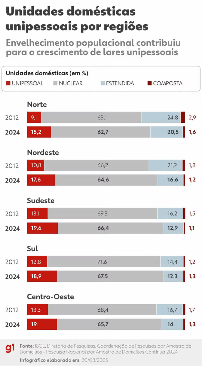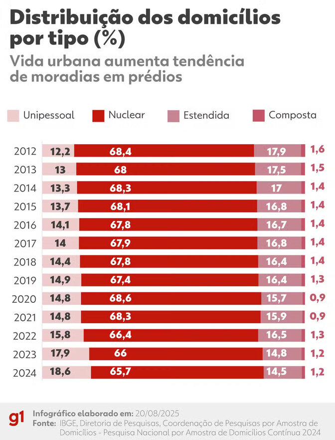 O número de pessoas que vivem sozinhas no Brasil está crescendo. Os domicílios unipessoais, aqueles com apenas um morador, passaram de 12,2% em 2012 para 18,6% em 2024, um aumento de 6,4 pontos percentuais em 12 anos.