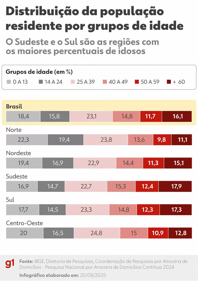 O Sudeste lidera, com 19,6% dos domicílios compostos apenas por pessoas idosas, seguido pelo Centro-Oeste (19%) e pelo Sul (18,9%).