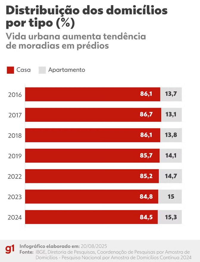 A PNAD Contínua também mostrou mudanças no tipo de moradia dos brasileiros. Entre 2016 e 2024, as casas, embora ainda predominantes, perderam espaço, enquanto os apartamentos ganharam participação, com alta de 1,6 ponto percentual.