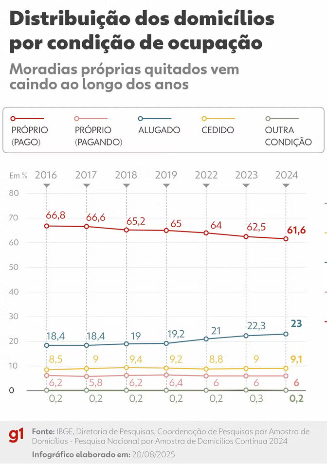 Apesar do aumento da renda ao longo do tempo e da melhoria nas condições de moradia, o acesso à casa própria continua sendo um desafio. Em 2024, quase um quarto dos brasileiros vivia de aluguel, um aumento de quase 5 pontos percentuais em oito anos.