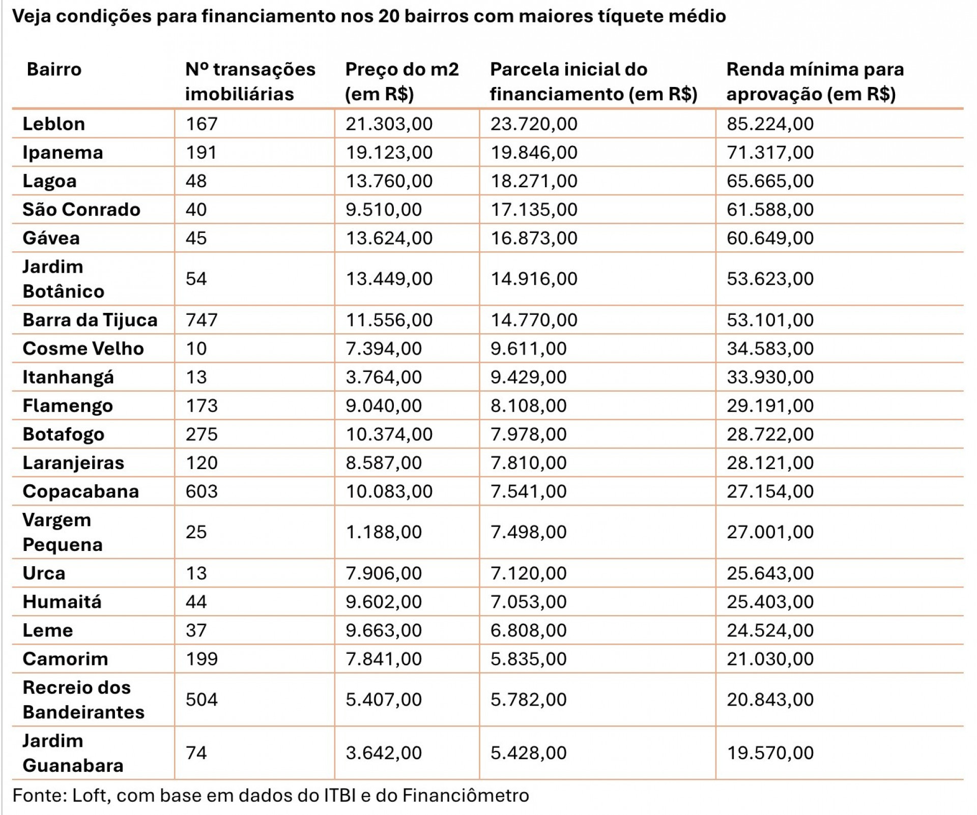 A estimativa considera os valores médios pagos pelos imóveis entre junho e julho de 2025, com base no ITBI (Imposto sobre Transmissão de Bens Imóveis), da Prefeitura do Rio, e nas condições médias atuais de financiamento nos principais bancos. Por exemplo: em regiões como Barra da Tijuca, Copacabana e Recreio dos Bandeirantes, a renda mensal exigida para aprovação do crédito varia, em média, entre R$ 21 mil e R$ 53 mil. Já em áreas como Santa Cruz, Guaratiba e Campo Grande, que também estão entre os 20 bairros com mais imóveis comercializados, é possível financiar com renda inferior a R$ 10 mil.